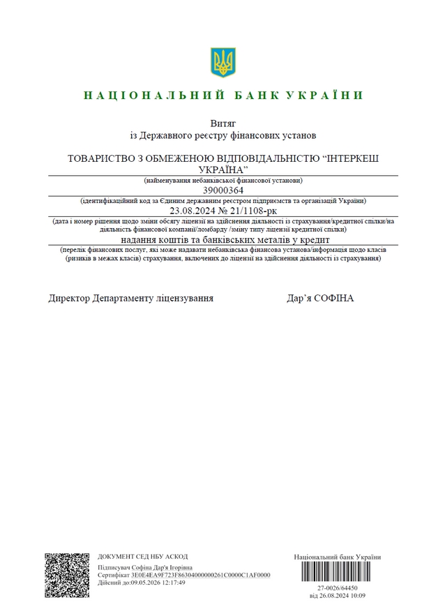 Компанія «Інтеркеш Україна» надає кошти та банківські метали у кредит.